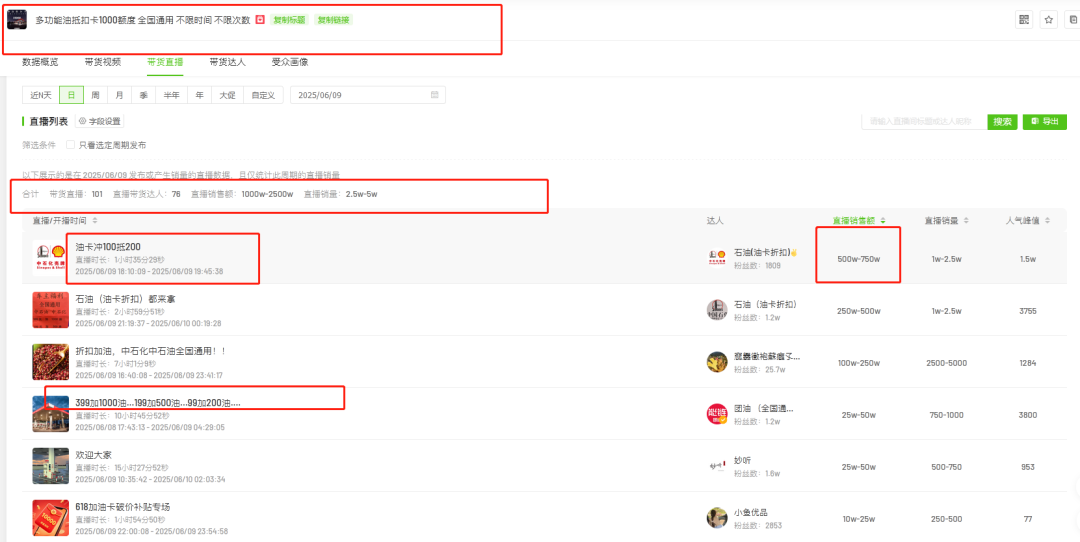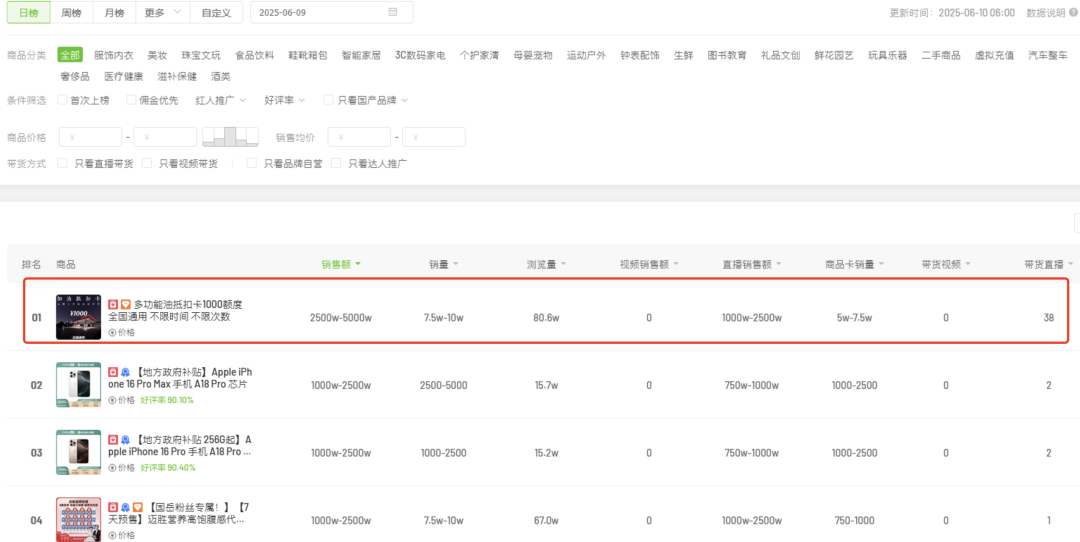 飞瓜数据显示,6月9日一条“多功能油抵扣卡1000额度”的商品链接销售额高达2500万~5000万元,登顶平台全品类商品销售榜首。记者查询发现,6月8日至9日期间有超过70个不同账号在同步推广这一商品链接,形成矩阵式营销网络。