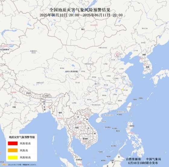 自然资源部与中国气象局6月10日18时联合发布地质灾害气象风险预警:2025年6月10日20时至11日20时,浙江西部局部、安徽南部局部地区将面临较高的地质灾害风险(黄色预警)。