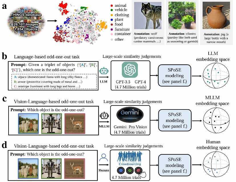 团队从认知神经科学出发,设计融合计算建模、行为实验与脑科学的创新范式,采用认知心理学“三选一异类识别任务”,要求大模型与人类从物体概念三元组(来自1854种日常概念组合)中选出最不相似的选项。通过分析470万次行为判断数据,团队首次构建AI大模型“概念地图”。