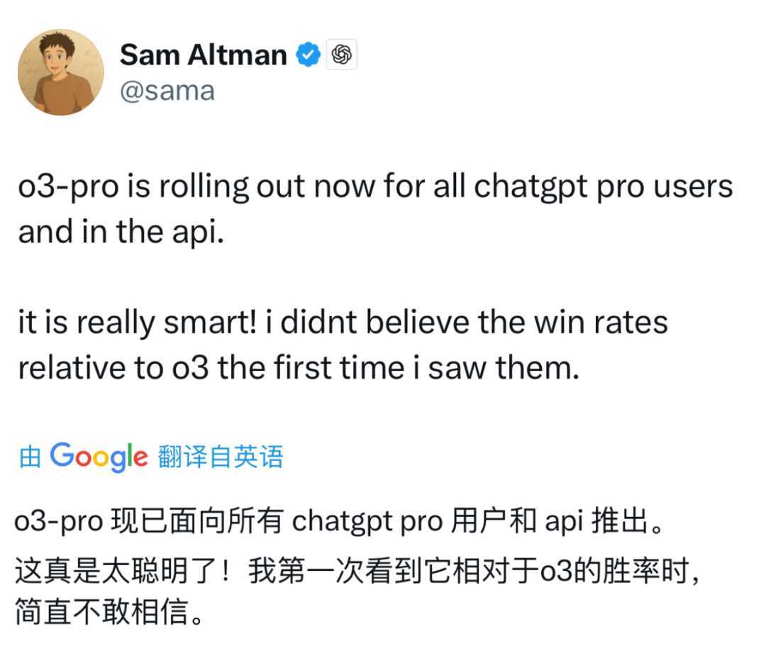 OpenAI CEO奥尔特曼(Sam Altman)兴奋地发文称,“o3-pro太聪明了!我第一次看到它相对于o3的胜率时,简直不敢相信。”