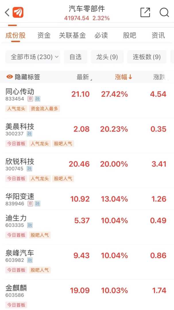 受该消息提振,6月11日早盘,汽车零部件概念股集体走强。东方财富汽车零部件板块上涨2.32%,多家相关上市公司股价涨停,市场反应热烈。