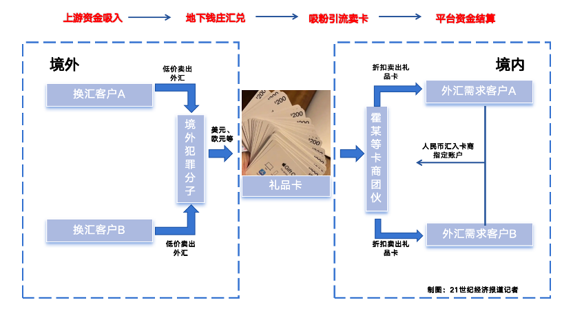 警方调查发现,这些看似普通的礼品卡交易背后,存在着“外币—礼品卡—人民币”的非法汇兑通道,涉及上游资金吸入、地下钱庄汇兑、吸粉引流卖卡、平台资金结算等环节。