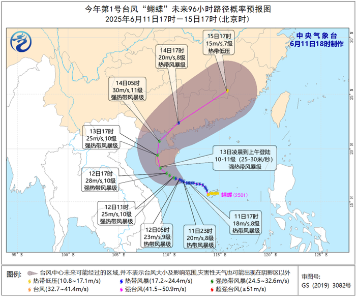 中央气象台6月11日18时发布台风黄色预警:今年第1号台风“蝴蝶”(热带风暴级)的中心今天(11日)下午5点位于海南三亚东偏南方向大约300公里的海面上,即北纬16.8度、东经111.9度,中心附近最大风力8级(18米/秒),中心最低气压为993百帕,七级风圈半径100-260公里。台风动态备受社会关注。