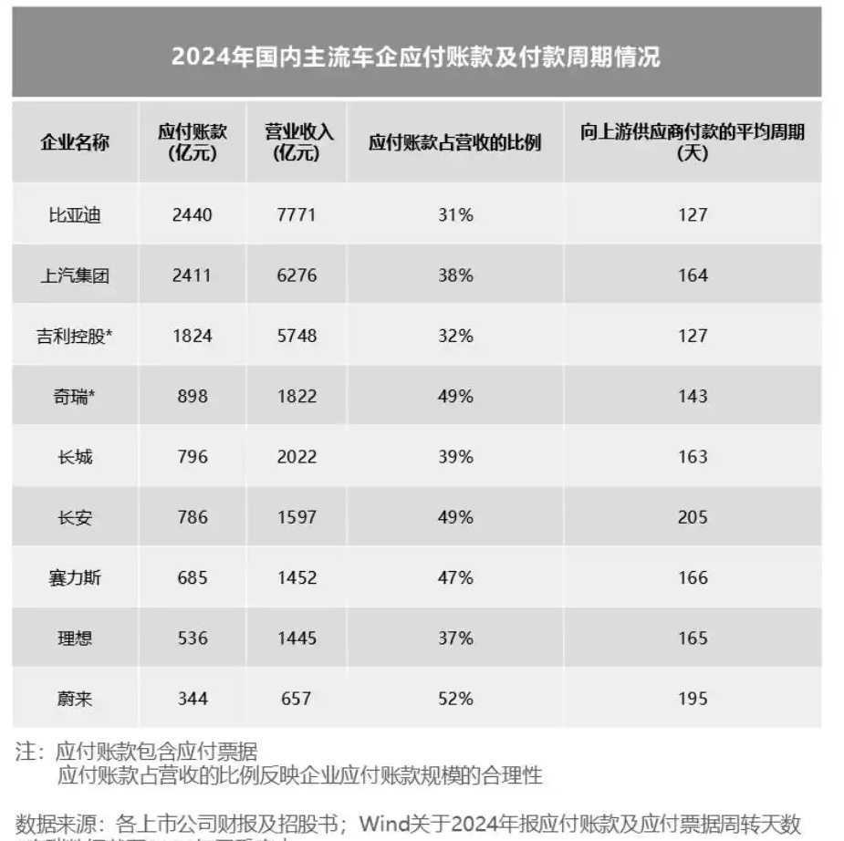 上游供应商因资金被长期占用,财务成本显著增加,利润受到挤压。数据显示,比亚迪、奇瑞、长城汽车、蔚来、长安等车企向上游供应商付款的平均周期均超过行业平均水平。