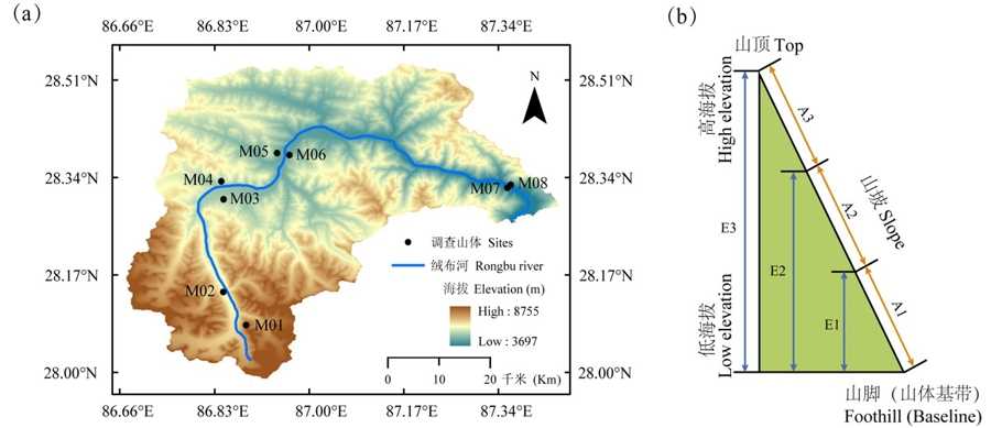 研究区域和调查山体的分布示意图显示了调查范围和划分。调查涉及绒布河流域从上游到下游的八个山体坡面,以及根据海拔高度划分的三个海拔段和每个山体的三种调查情景。