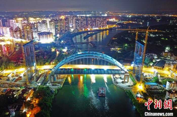 图为平陆运河金海湾大桥全桥拱肋合龙施工现场。平陆运河集团供图。这一项目的成功实施,将进一步促进区域经济发展,提升交通运输效率。