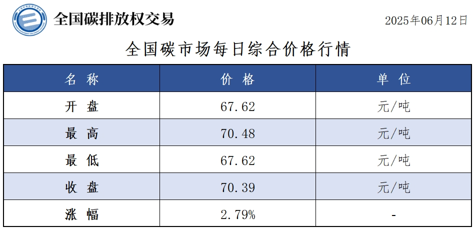 新华财经北京6月12日电 据微信公众号“全国碳交易”消息,6月12日全国碳市场综合价格行情表现强劲,开盘价为67.62元/吨,盘中最高攀升至70.48元/吨,而最低价则维持在开盘价67.62元/吨,最终收盘价定格在70.39元/吨,较前一日显著上涨2.79%,显示出碳市场交易活跃度提升。
