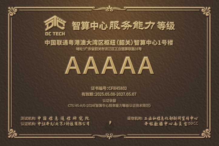 近年来,随着人工智能进入快速发展阶段,“算力”和“数据”已成为推动产业发展的核心基础设施。中国联通积极响应国家“东数西算”战略,精心打造中国联通粤港澳大湾区枢纽(韶关)数据中心。作为中国联通“5+4+31+X”架构中的重要一环,该数据中心不仅是新型绿色数据中心,更是韶关集群首个通过国A认证和等保三级认证的数据中心。近期,它再次获得全国首批、粤港澳大湾区首家5A级智算中心服务能力认证。