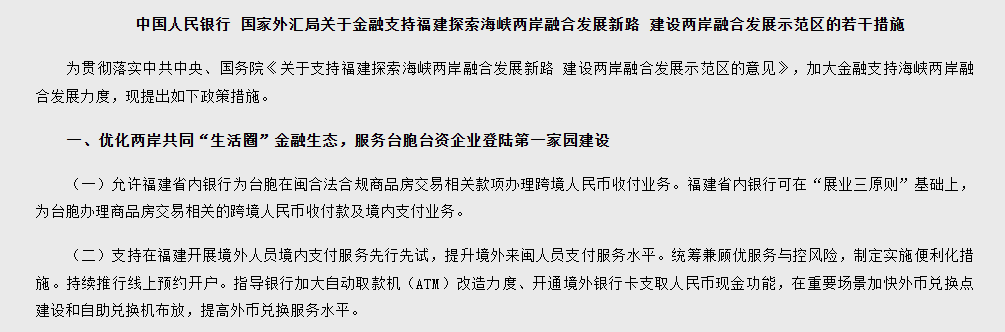 中国人民银行、国家外汇局表示,将积极推动《若干措施》落实落细,加大金融支持海峡两岸融合发展力度,为两岸融合发展示范区建设提供坚实金融支撑。