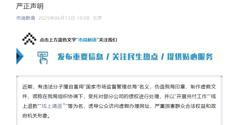 6月13日上午,国家市场监督管理总局微信号发布“严正声明”。声明揭露,有违法者擅自冒用“国家市场监督管理总局”名义,伪造印章,制作虚假文件,谎称受总局委托处理公司债权,并以“开展兑付工作”“线上退款”“线上清退”等名义,诱导公众访问虚假网址。