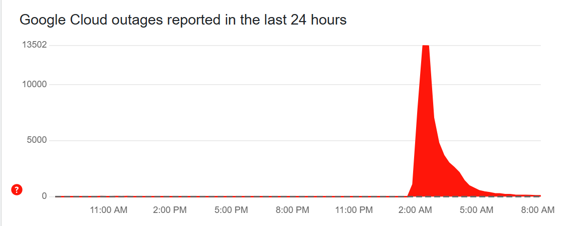 报告数量在美国东部时间下午2点左右开始激增,并在下午2:30至3:00左右达到峰值,随后大多数平台的故障逐渐缓解,部分用户访问权限恢复。同时,截至美东时间下午3点,已有超过1.3万名用户报告谷歌云出现故障。