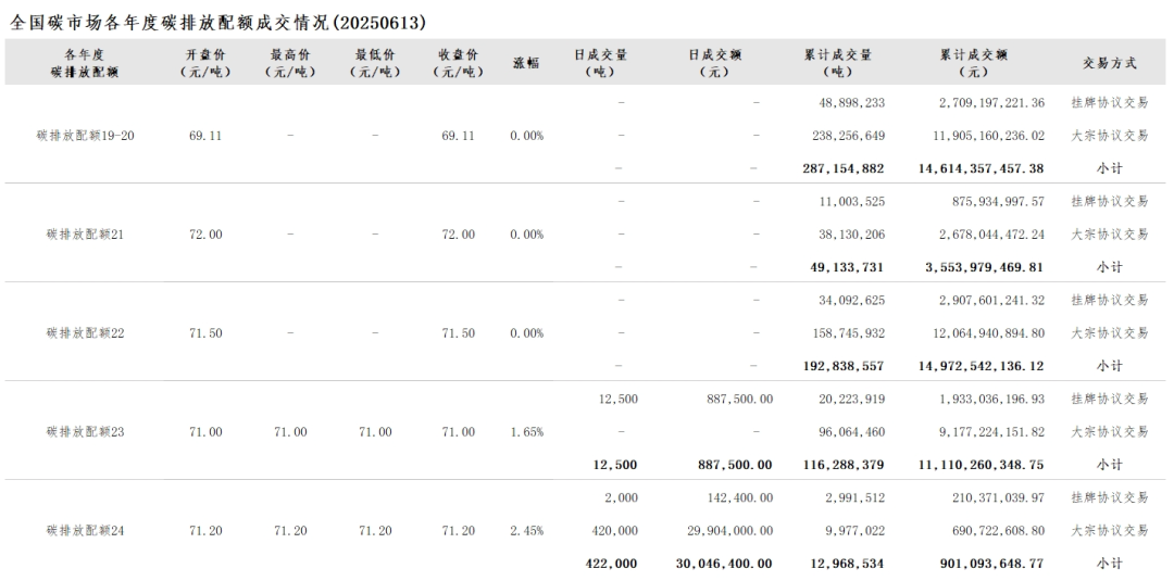 6月13日全国碳市场综合价格行情稳健,开盘价70.62元/吨,收盘价70.96元/吨,上涨0.81%。今日挂牌协议交易成交量14,500吨,大宗协议交易成交量420,000吨。全国碳排放配额总成交量434,500吨,显示出碳市场交易活跃度的提升。