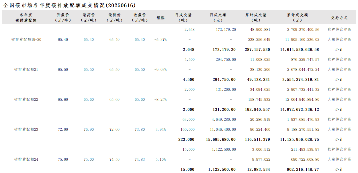 自2025年1月1日至6月16日,全国碳市场碳排放配额成交量累计达到28,362,567吨,成交额更是突破了2,136亿元大关,达到2,136,923,266.52元。这一数据彰显了我国碳市场在推动碳减排、促进绿色发展方面的积极作用。