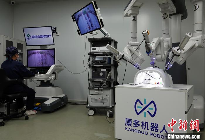 企业创新研发的康多手术机器人开展操作培训。中新网记者孙自法摄