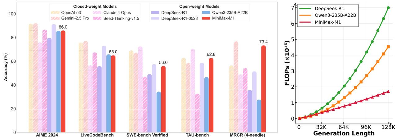 此外,在长文本能力上,M1模型原生支持高达100万Token的上下文窗口,这一数字与谷歌最新的Gemini 2.5 Pro持平,是DeepSeek-R1(12.8万Token)的近8倍。同时,它还支持业内最长的8万Token推理输出。