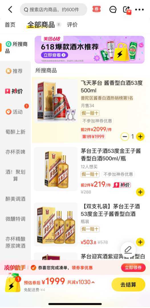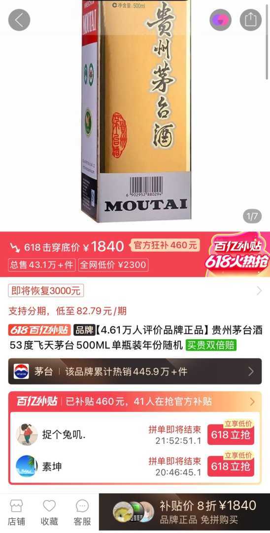 这场由平台补贴驱动的价格调整,正在引发从流通渠道到消费终端的连锁反应,一定程度上也再现白酒行业库存高企、价格倒挂的困境。美团闪购首次参战618,推出“万瓶1499飞天茅台限时抢”活动,白酒整体成交额破3亿元。在拼多多618百亿补贴下,飞天茅台以1840元限购一瓶的预估价刷新全网低价。