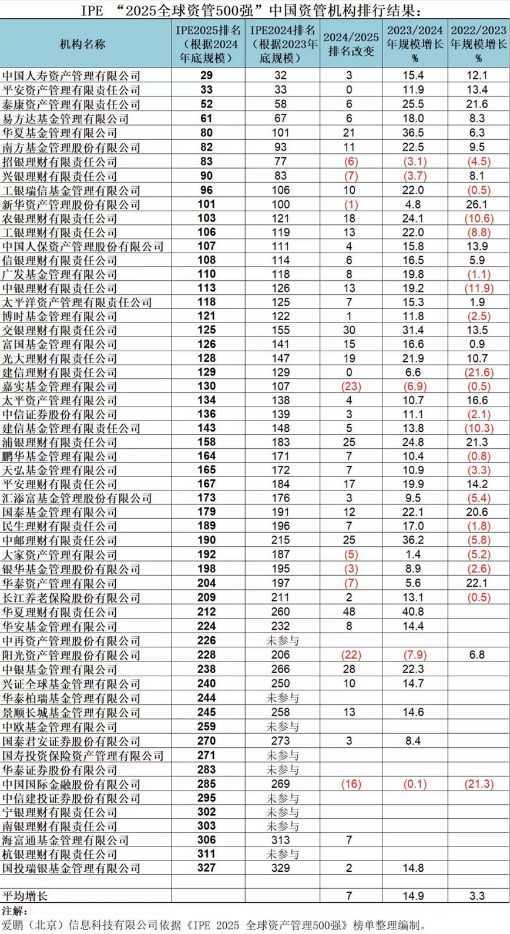 6月17日,欧洲出版集团“欧洲投资与养老金”发布“2025全球资管500强”报告,共57家中国资管公司上榜。相较上一年,中国资管公司平均提升7位,管理规模增长14.9%,且首次进入全球资管前30强。