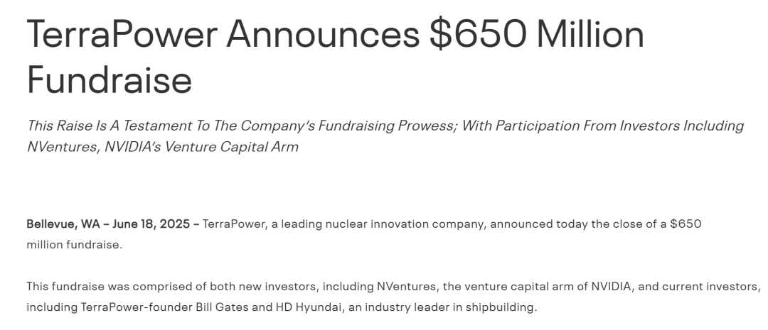 比尔·盖茨创办的泰拉能源完成6.5亿美元融资,英伟达旗下风投部门参与。公司筹集超20亿美元私人融资,获美国政府20亿美元拨款,用于建造美国首座商业化运营的先进核电站。