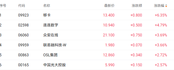 同期的稳定币概念股也走强。移卡(09923.HK)、连连数字(02598.HK)、众安在线(06060.HK)分别上涨6.51%、4.60%、3.93%。