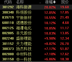 6月19日,固态电池板块短线拉升,截至发稿,海科新源20%涨停,科恒股份涨超12%,湘潭电化、丰元股份等涨停,宁新新材、金银河、江特电机、曼恩斯特等跟涨。