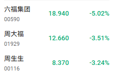 近日国际金价因中东冲突等因素持续备受市场关注,不过金价走强的同时,黄金首饰股也在下挫。截至发稿,六福集团(00590.HK)、周大福(01929.HK)、周生生(00116.HK)分别下跌5.02%、3.51%、3.24%。