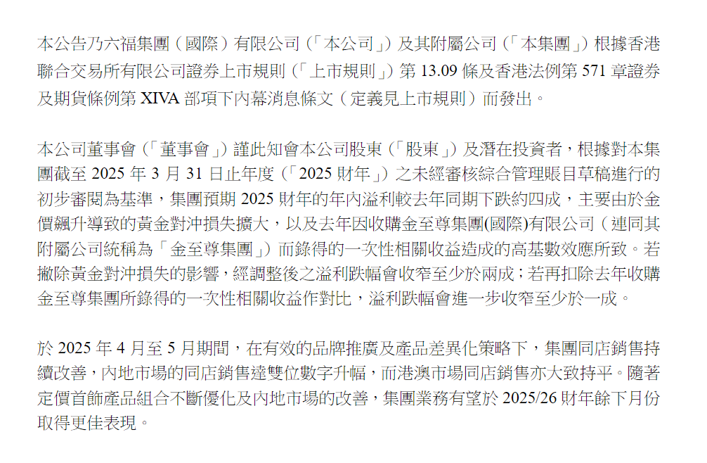 公告中还指出,利润下滑主要是由于金价飙升导致的黄金对冲损失扩大,以及去年因收购金至尊集团而录得的一次性相关收益造成的高基数效应。