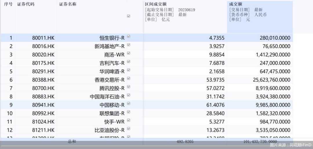 聚焦到个股表现上,在人民币柜台上,过去两年间,中国移动-R、中国平安-R、腾讯控股-R成交额居前,分别为61.31亿元、57.98亿元以及56.94亿元;港股柜台上,腾讯控股、阿里巴巴-SW、美团-W交易规模处于前三位置,分别为4.39万亿元、3.21万亿元以及2.44万亿元。