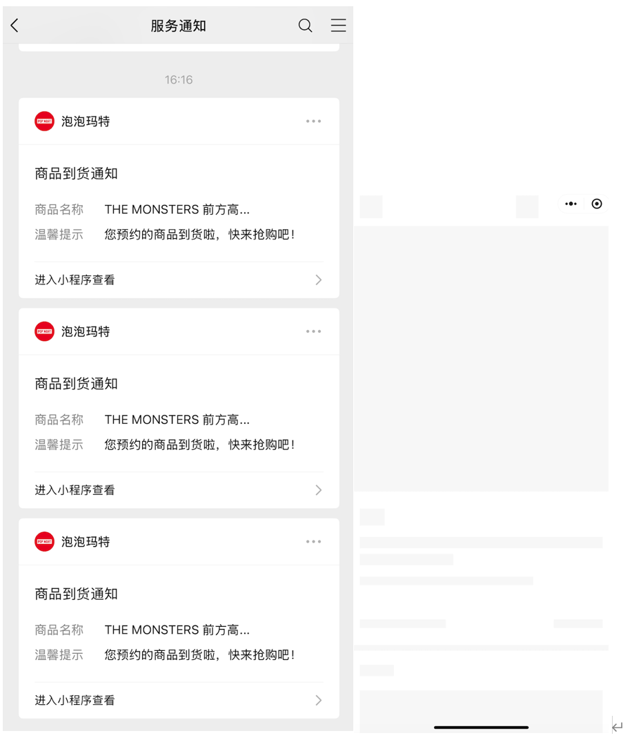 自6月18日下午开始,泡泡玛特官方商城小程序多次弹出相关商品的补货通知,同时在天猫官方旗舰店、抖音潮玩直播间等也大量放货。不过记者发现,点进微信小程序链接后,依然无法进入正常的购买界面。