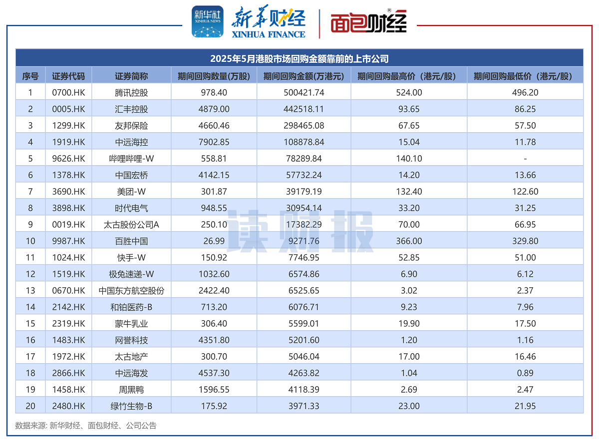 新华财经北京6月20日电新华财经和面包财经研究员梳理的公开资料显示,2025年5月港股共有91家上市公司发起回购,累计回购7.5亿股,回购金额合计达170.19亿港元,较去年同期的193.82亿港元下降12.19%。其中,哔哩哔哩、美团、绿竹生物、药师帮等公司于5月首度进行年内回购或明显加大回购力度。行业方面,2025年5月发起回购的港股上市公司主要分布在软件服务、医疗保健设备和服务、媒体及娱乐等行业。港股上市公司5月回购总额170.19亿港元。根据信披数据,2025年5月港股共有91家上市公司发起回购,累计回购7.5亿股,回购金额合计达170.19亿港元,较去年同期的193.82亿港元下降12.19%。从个股来看,腾讯控股、汇丰控股及友邦保险5月回购金额居于前列。此外,哔哩哔哩、美团、绿竹生物、药师帮等公司于5月首度进行年内回购或明显加大回购力度。