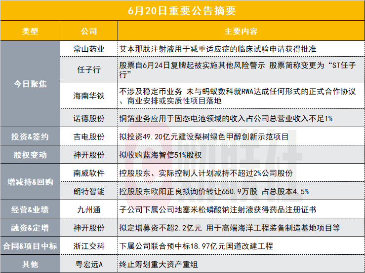 本文汇总了今日财经领域的重要资讯,包括常山药业艾本那肽注射液获批减重适应症临床试验,澜起科技拟发行H股并回购股份,诺德股份澄清铜箔业务在固态电池领域贡献有限等。同时,还涵盖了任子行股票复牌并实施风险警示、海南华铁澄清稳定币合作传闻、宁波华翔上半年预计亏损等多家公司公告。