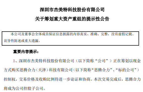 6月20日晚间,杰美特(300868)公告称,公司正在筹划以现金方式购买思腾合力(天津)科技有限公司(简称“思腾合力”)控制权,交易价格及收购比例待进一步论证和协商。本次交易完成后,思腾合力将成为公司控股子公司。根据初步测算,本次交易可能构成重大资产重组。