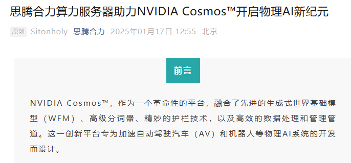 今年1月17日,思腾合力在官网披露,思腾合力算力服务器强效支持NVIDIA Cosmos算力。
