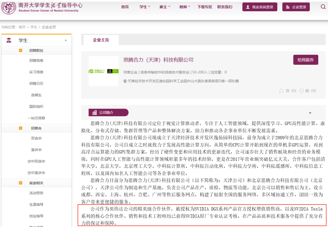 思腾合力发布在南开大学学生就业指导中心的信息显示,公司作为英伟达公司的精英级合作伙伴,被授权为NVIDIA DGX系列产品官方授权增值销售商,以及NVIDIA Tesla系列的核心合作伙伴。公司销售和技术工程师均已获得NVIDIA原厂专业认证考核,在产品品质和技术服务中提供了充分有力的保证和保障。