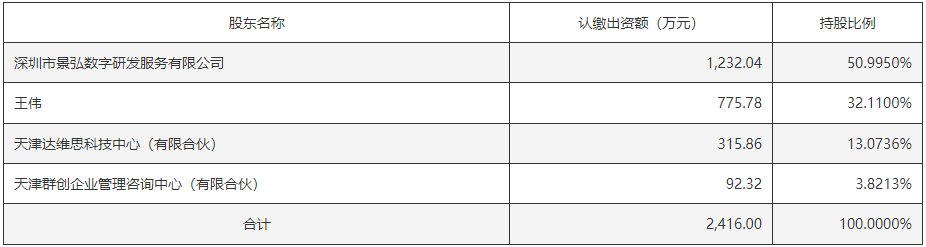 股权结构上,深圳市景弘数字研发服务有限公司、王伟、天津达维思科技中心(有限合伙)、天津群创企业管理咨询中心(有限合伙)分别持有思腾合力股权50.9950%、32.1100%、13.0736%、3.8213%。