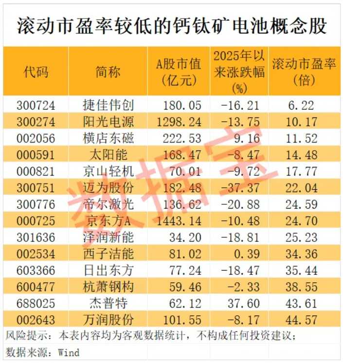 钙钛矿电池处于产业化初期,预计2030年我国光伏组件渗透率达30%,新增产能将达161GW。A股市场上布局该技术的公司近30家,概念股今年平均下跌9.41%,部分估值处于较低水平。