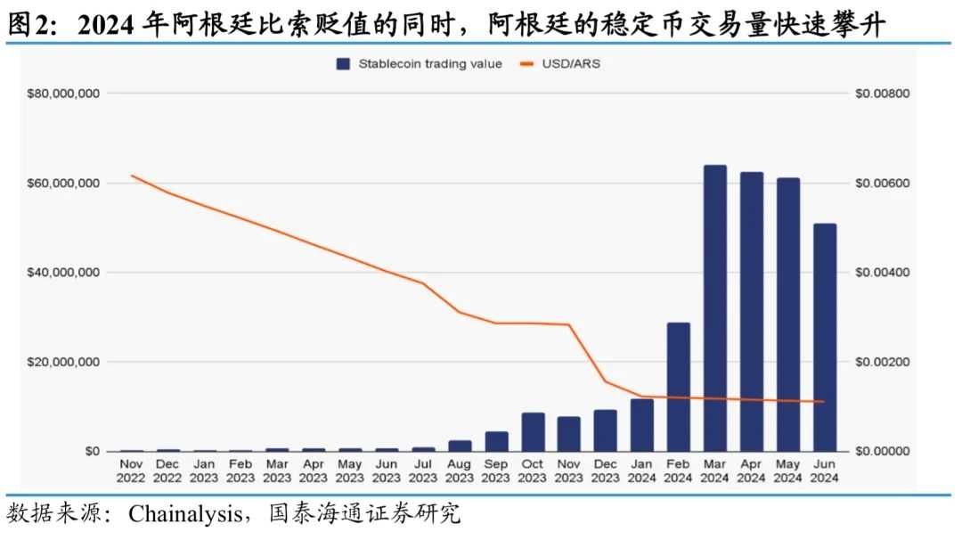 美元稳定币的快速发展并不会弱化美元信用,而会进一步强化美元地位,反而拓宽了美元的功能和使用范围。而美元稳定币可能对于其他经济体尤其是汇率贬值压力大的法定货币反而冲击较大。例如阿根廷居民便在比索贬值期间增持美元稳定币。
