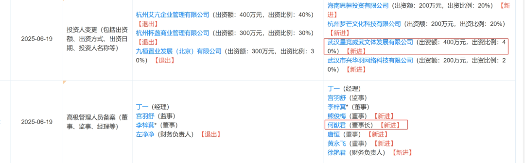 寰聚商业6月19日发生股权变动,公司老股东全部退出,武汉星竞威武文体发展有限公司、武汉市兴华羽网络科技有限公司、杭州梦芒文化科技有限公司、海南思恒投资有限公司成为新股东,分别持股40%、20%、20%、20%。其中武汉星竞威武文体发展有限公司由星竞威武(香港)有限公司旗下的武汉木叶村网络科技有限公司100%持股,何猷君是创始人。