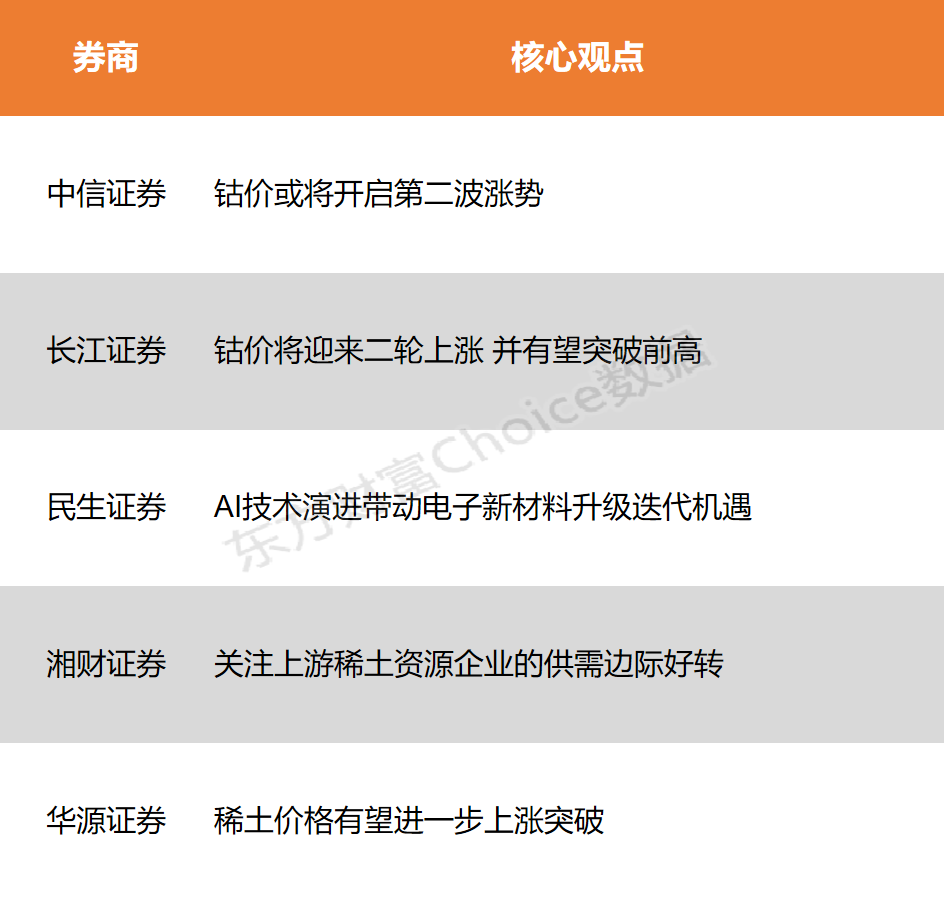刚果(金)公布,2025年6月21日起,战略矿产市场监管局(ARECOMS)董事会采取了重大监管措施,鉴于市场上库存量持续高企,已决定将临时禁令的期限自本决定生效之日起再延长三个月,适用于刚果所有源自采矿的钴出口。长江证券表示,刚果金宣布延长钴出口禁令3个月,钴价将迎来二轮上涨,并有望突破前高;民生证券认为,AI技术演进带动电子新材料升级迭代机遇,军工需求逐步回暖军工新材料深度受益;华源证券指出,稀土价格有望进一步上涨突破。