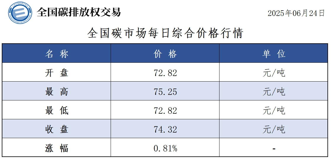 新华财经北京6月24日电据微信公众号“全国碳交易”,6月24日全国碳市场综合价格行情为开盘价72.82元/吨,最高价75.25元/吨,最低价72.82元/吨,收盘价74.32元/吨,收盘价较前一日上涨0.81%。碳市场作为新兴市场,其价格波动备受关注。