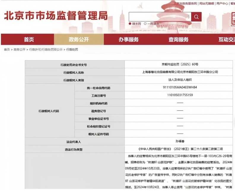 营销曾翻车,创始人致歉。据媒体公开报道,林清轩三年砸7.6亿营销,曾多次因虚假宣传被罚。今年2月,北京市朝阳区市场监督管理局发布了一则行政处罚公告。林清轩关联公司因在广告宣传中使用“山茶花抗老修护”相关字样,涉嫌虚假广告,被罚款2.1万元。2月26日,林清轩创始人孙来春对此次处罚进行了回应,表示会强化全员合规培训,并建立宣传话术实时审查机制。