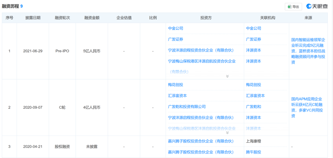成立18年来,听云公司共完成9轮融资。天眼查显示,最近的一次融资发生在2021年6月底,本轮Pre-IPO轮融资共融资5亿元,中金公司、广发证券、沣源资本等重磅战略投资人加入,蓝桥资本担任战略融资顾问并参与投资。