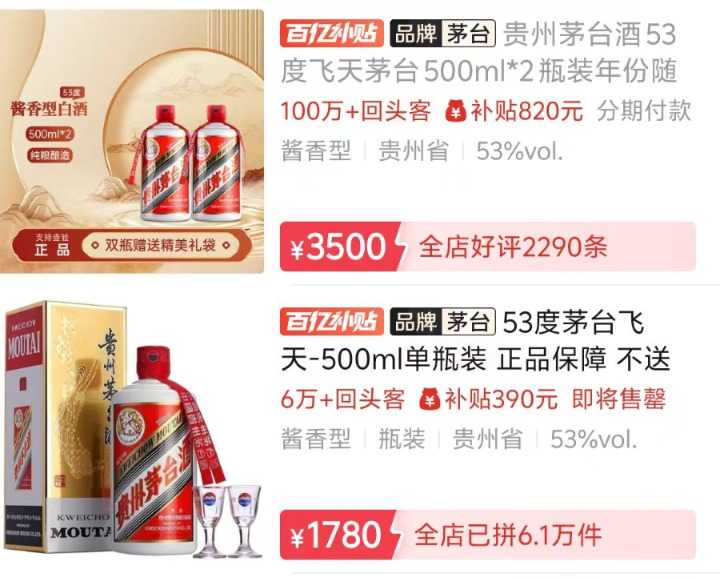 此外,第三方电商平台显示,百亿补贴的飞天茅台价格为1750元/瓶、1780元/瓶,这与今日酒价的报价基本维持一致。