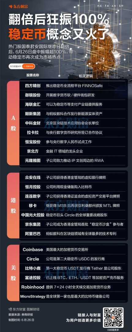 6月26日稳定币题材持续火爆,国泰君安国际因获虚拟资产交易服务牌照成热门股。A股、港股、美股均有稳定币相关个股,巨头纷纷入局稳定币赛道,彰显其未来市场发展潜力。