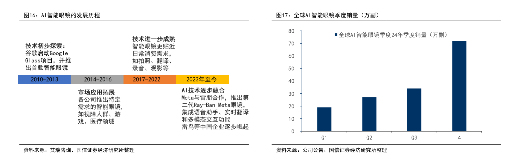 AI眼镜最早可以追溯至2008年立项的爱普生AR眼镜BT-100,2012年Google Project Glass将智能眼镜概念引入大众视野。十余年的发展时间,AI眼镜从小众产品升级为开始产生规模化产品需求的品类。据Wellsenn XR,2025年一季度,全球AI智能眼镜销量60万台,同比增长达216%,主要由Ray Ban Meta贡献。除了小米,下半年阿里、三星等十几个品牌也将发布新品,Meta预计将在三季度发布多款不同功能和形态的AI智能眼镜。AI眼镜市场蓬勃发展,前景广阔。