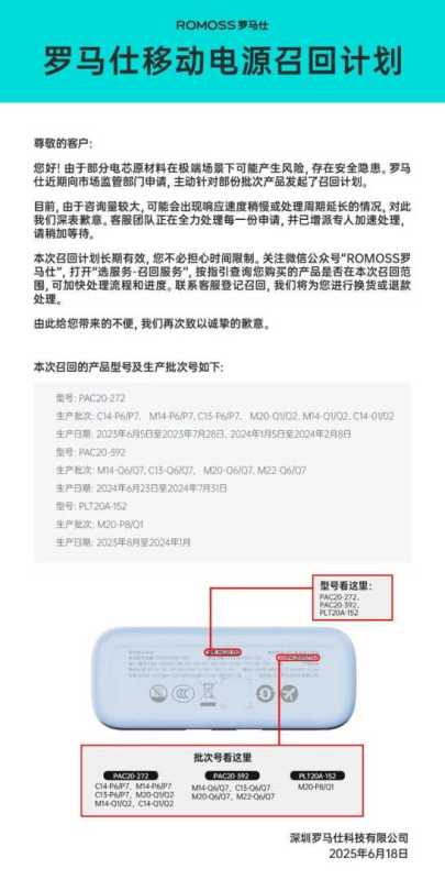 罗马仕在召回计划中表示,召回PAC20-272、PAC20-392、PLT20A-152型号移动电源,原因是部分电芯原材料在极端场景下可能产生燃烧风险,存在安全隐患。