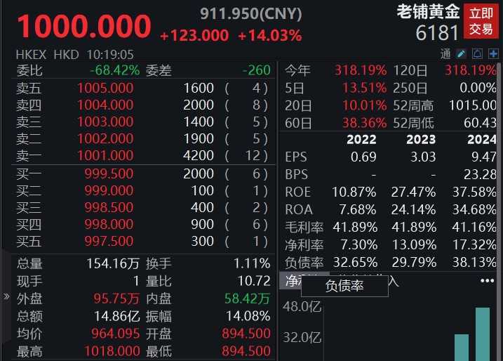 6月30日,港股老铺黄金持续拉升,一度涨超15%再创历史新高,最高报1018港元。截至发稿,该股涨超14%。