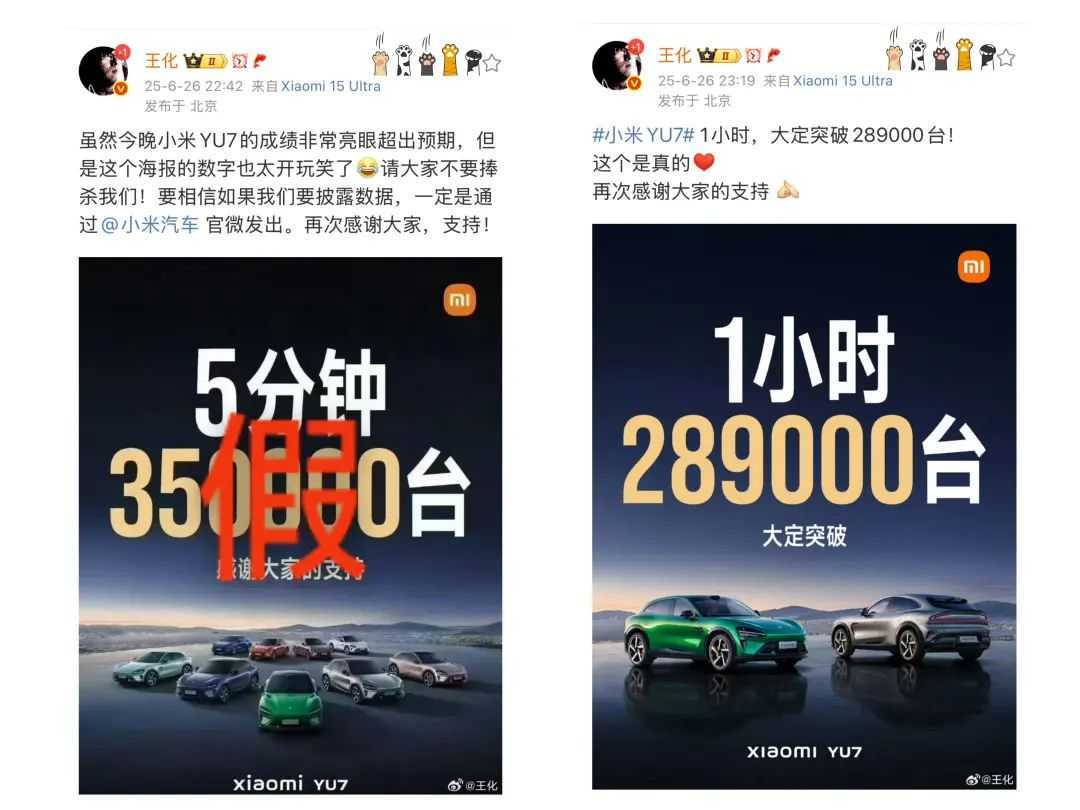 6月26日晚,小米集团公关部总经理王化先辟谣“5分钟35万台大定”消息,后发布“1小时28.9万台大定”消息。