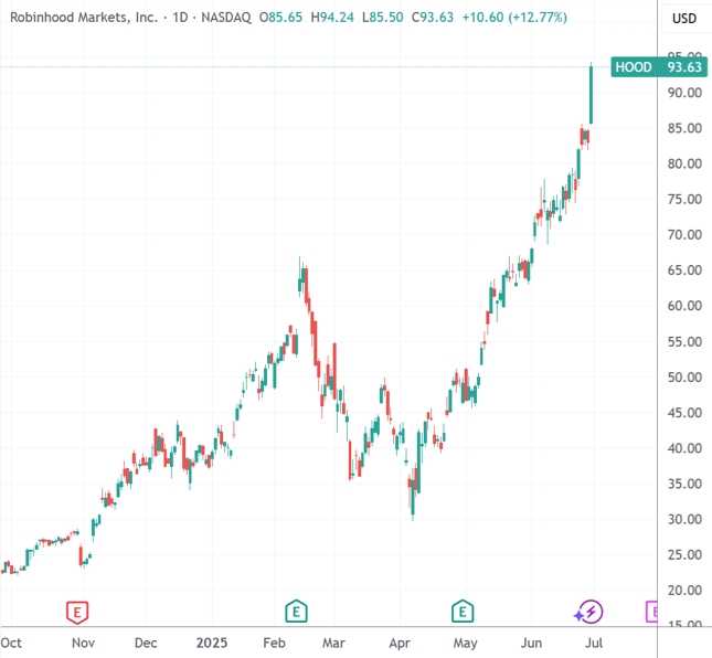 在加密货币ETF取得进展的同时,美国股票“代币化”的进程也在加速。美国互联网券商Robinhood周一在法国戛纳宣布,将向欧洲用户推出OpenAI和SpaceX的代币化股票。这两家备受瞩目的公司并未上市,所以它们的股权历来只属于内部员工和超高净值投资者持有。此举标志着继二级市场股票之后,私募股权也开始通过区块链进行零售交易。受此消息影响,Robinhood周一大涨12.7%,续创历史新高。目前Robinhood已经支持200余种代币化股票和ETF产品一周5天、每天24小时的零佣金和零点差交易。