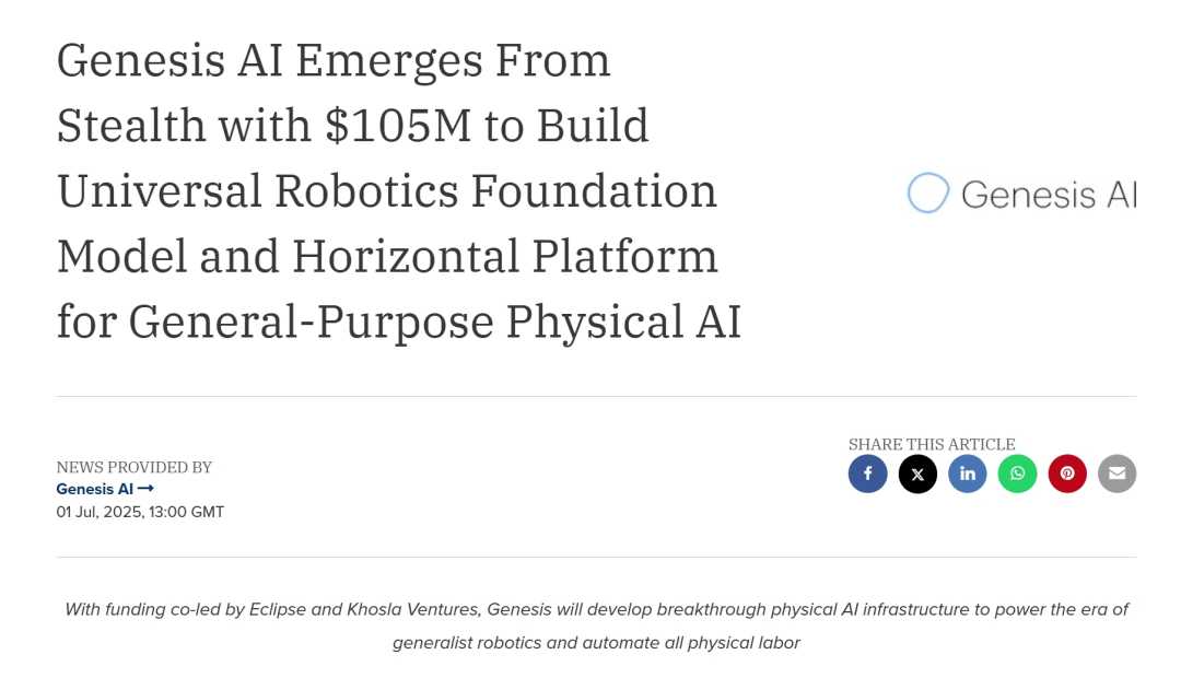Genesis AI获1.05亿美元融资,聚焦机器人通用模型开发