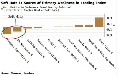 从历史上看,软数据承压期几乎每次都伴随着美联储降息。硬数据冲击更罕见,仅在经济衰退期间发生。目前软数据压力可从世界大型企业联合会的领先指标中看出。